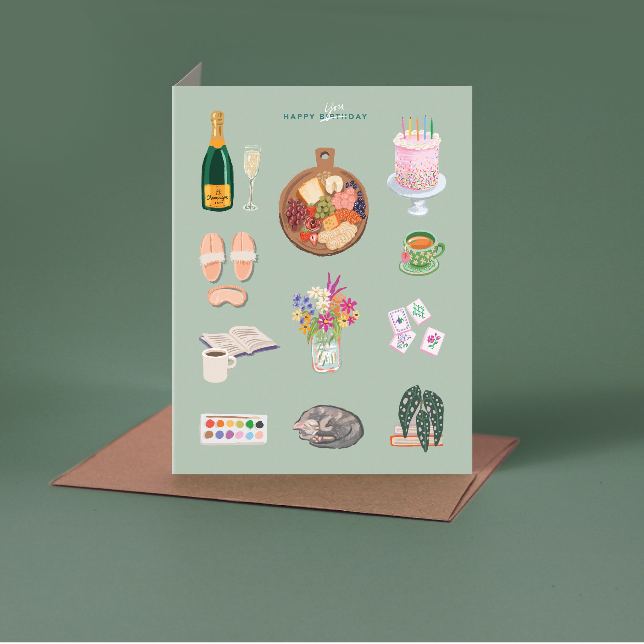 This birthday card is filled with darling illustrations of all their favorite things: champagne, charcuterie, cake, kittens, a good book, mahjong, tea, flowers, and more! Printed on ultra-thick card stock, this card comes blank inside for your own message.
