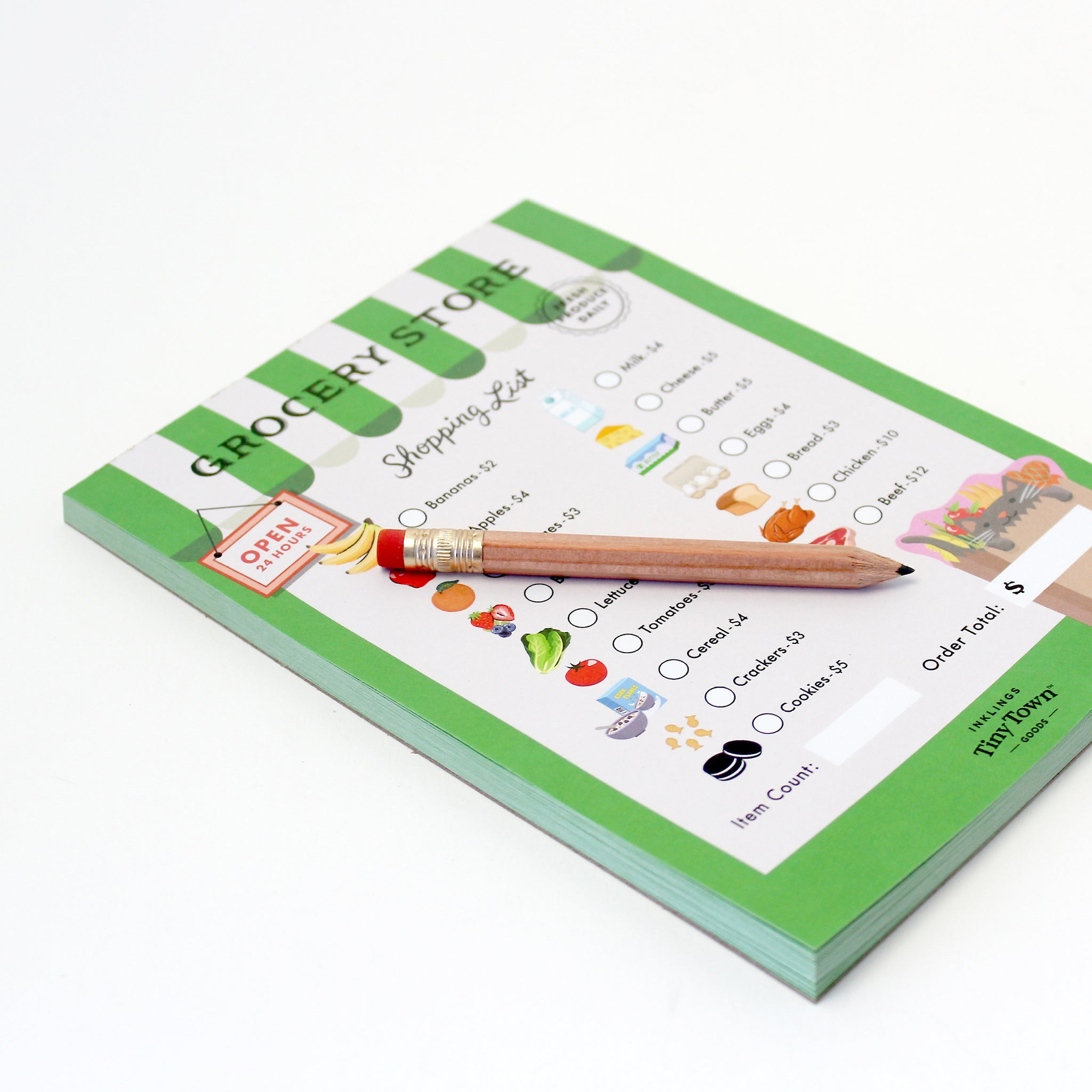 Welcome to Tiny Town, where kids can create their own imaginary adventures with creative, open-ended pretend play! With 50 sheets to use and share, this vibrant notepad and cute coordinating mini pencil is just what they need for screen-free fun! This is a great activity for kids to play grocery store. Pair it with play food for a darling and unique gift idea!