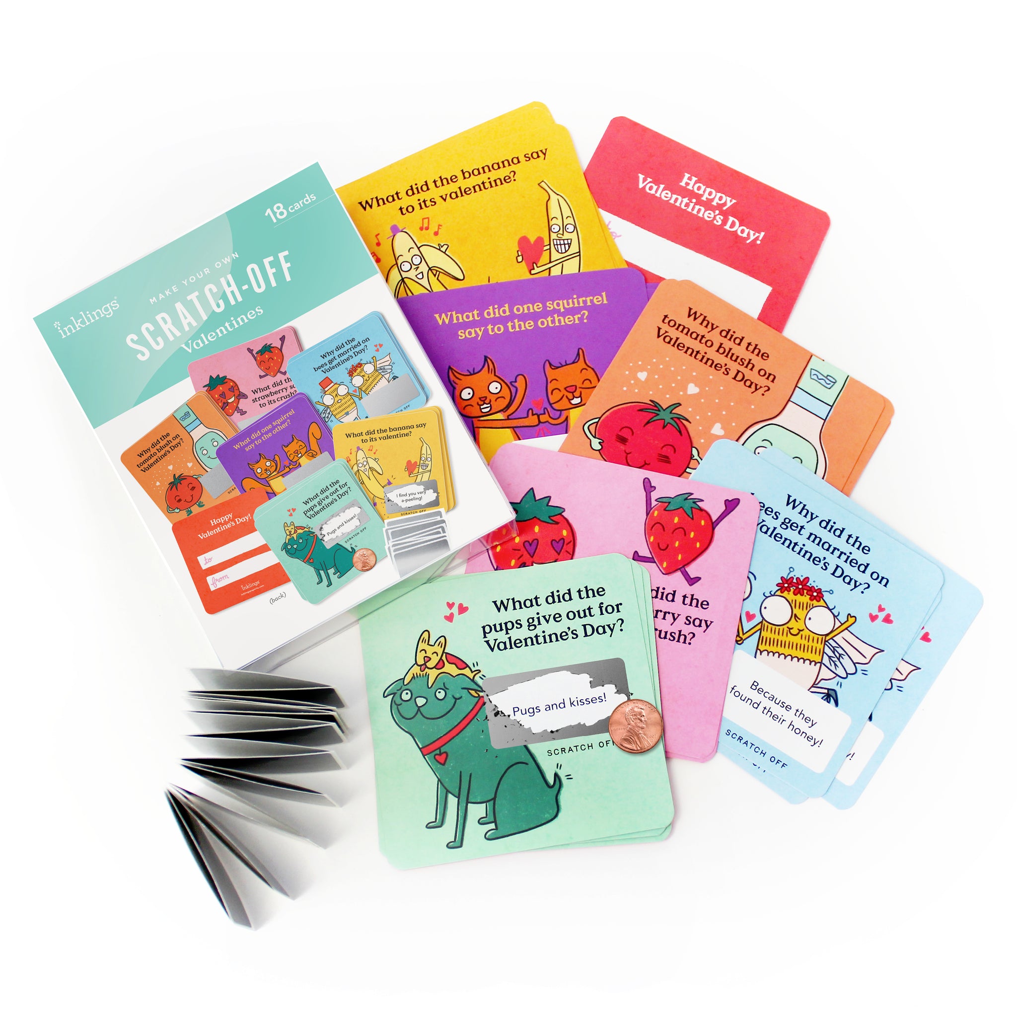 Make your own scratch-off valentines! This adorable set of valentines includes 18 flat cards and 18 scratch-off stickers that are fun and easy to assemble! Pick a valentine, then cover the white rectangle with a scratch-off sticker. Scratching with a coin will reveal the joke.