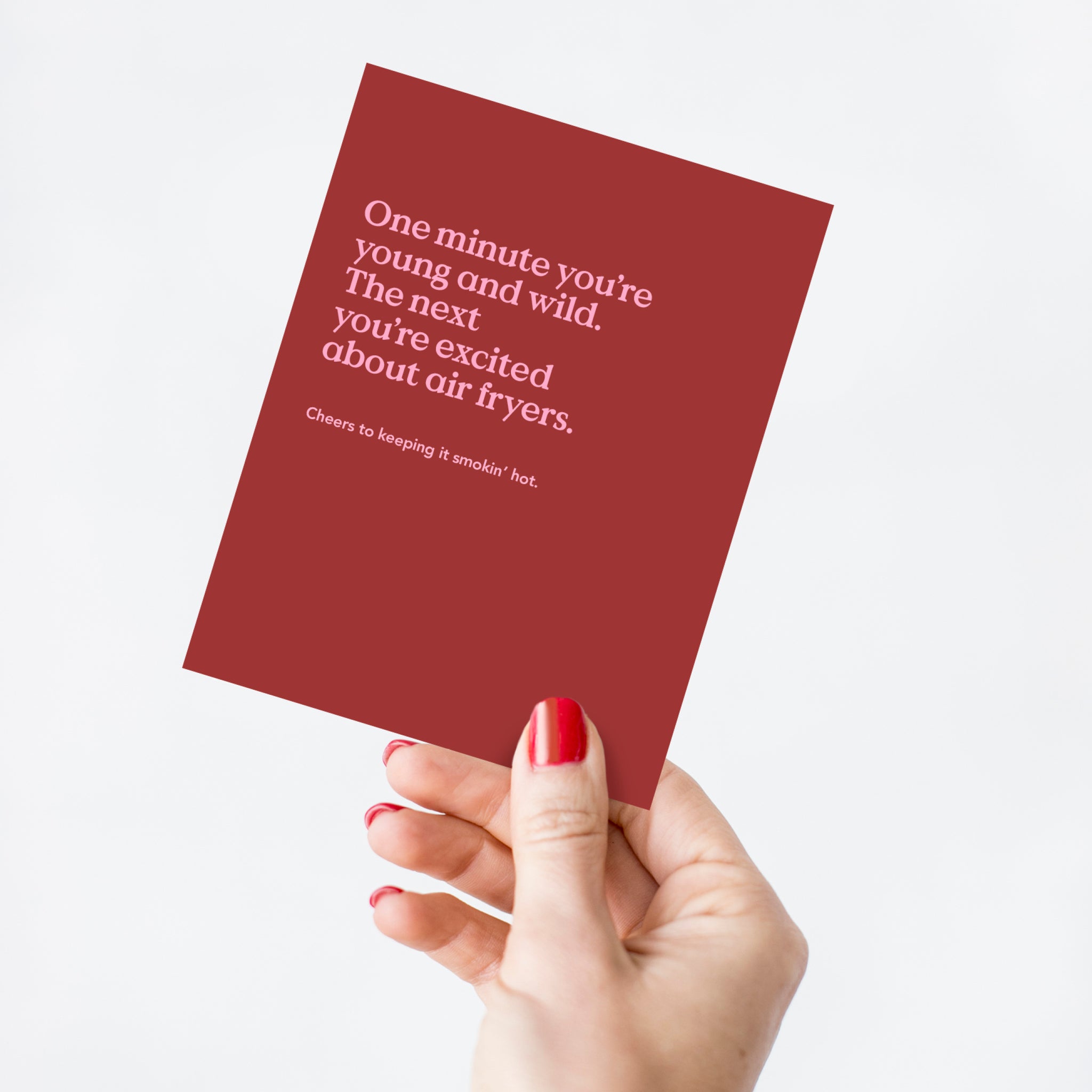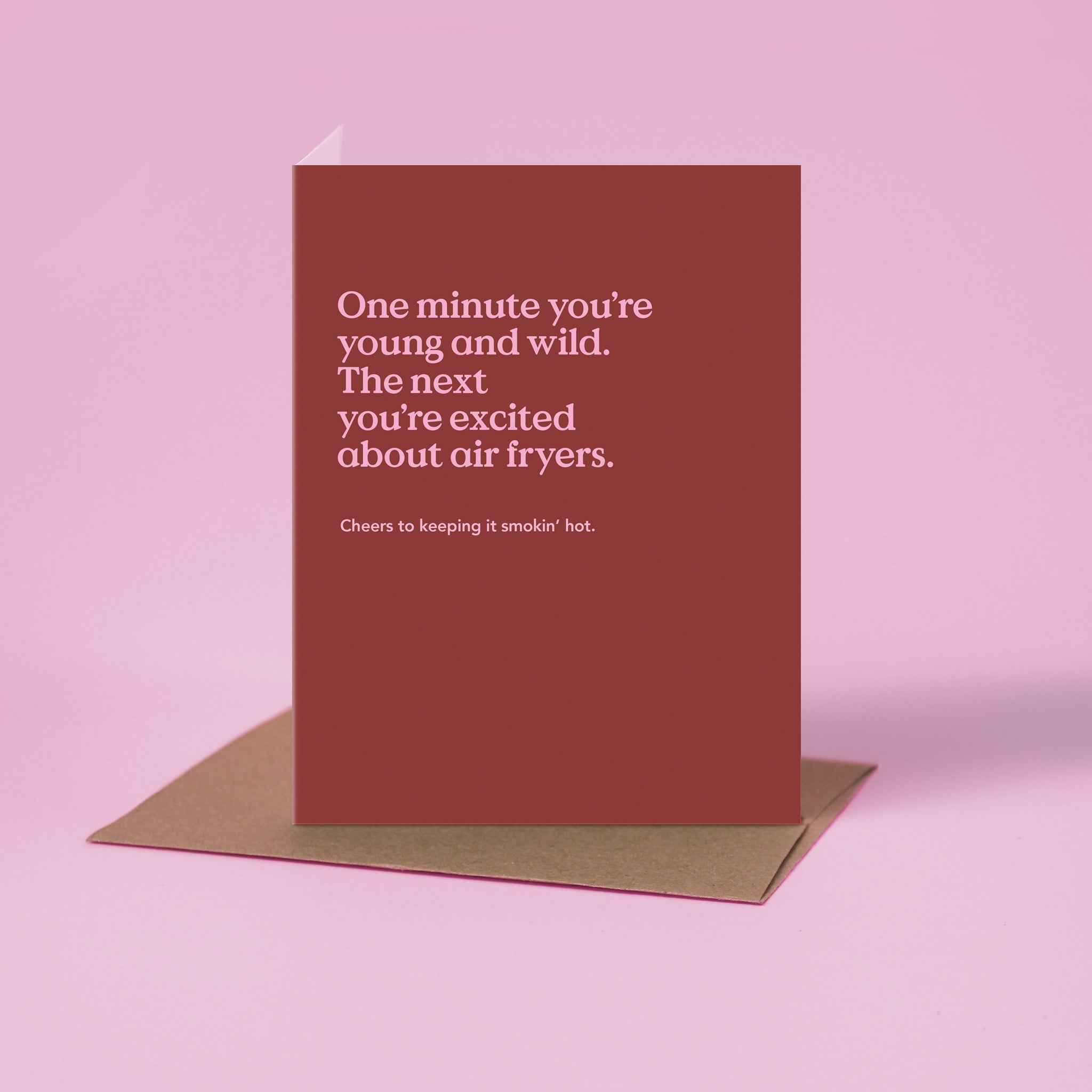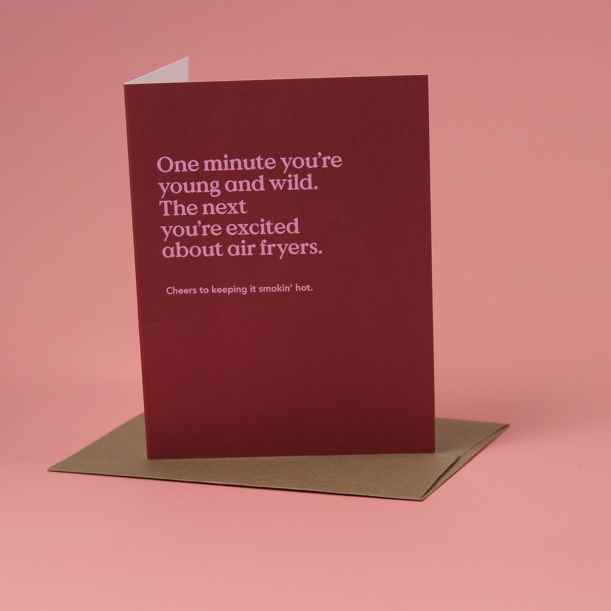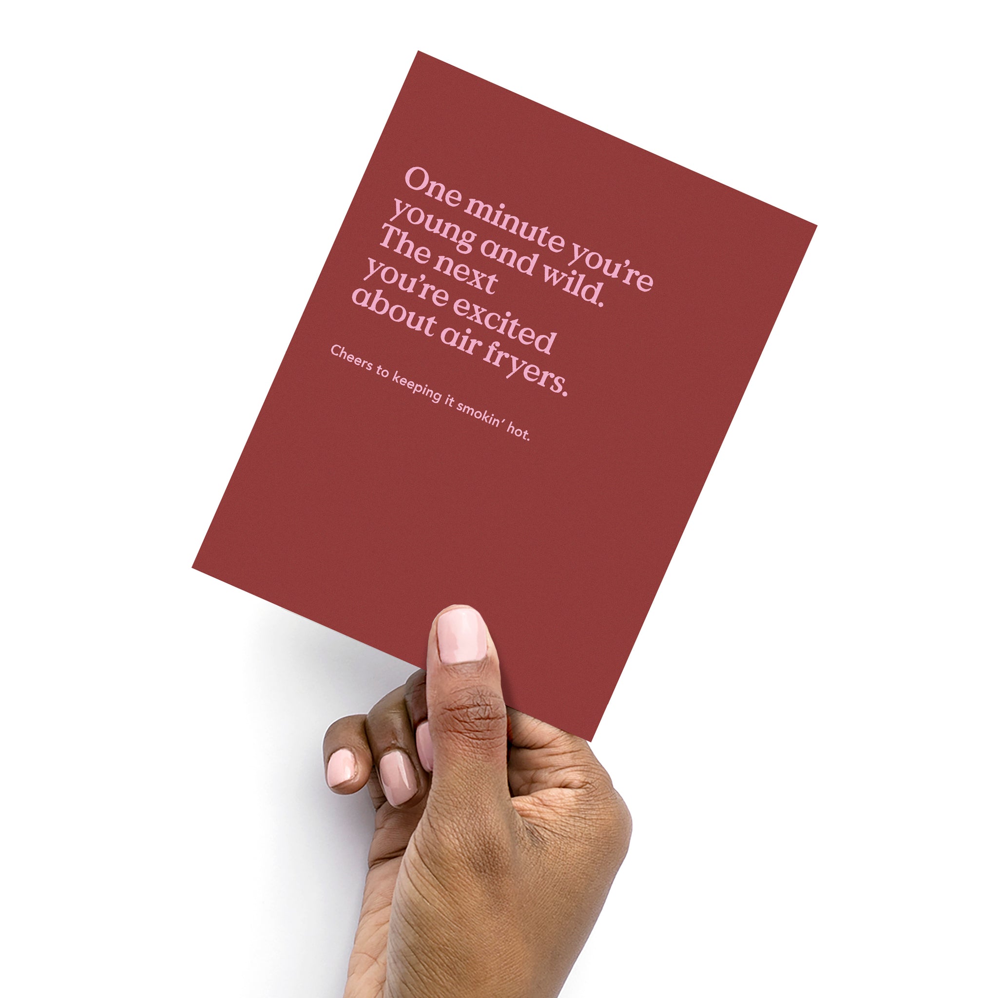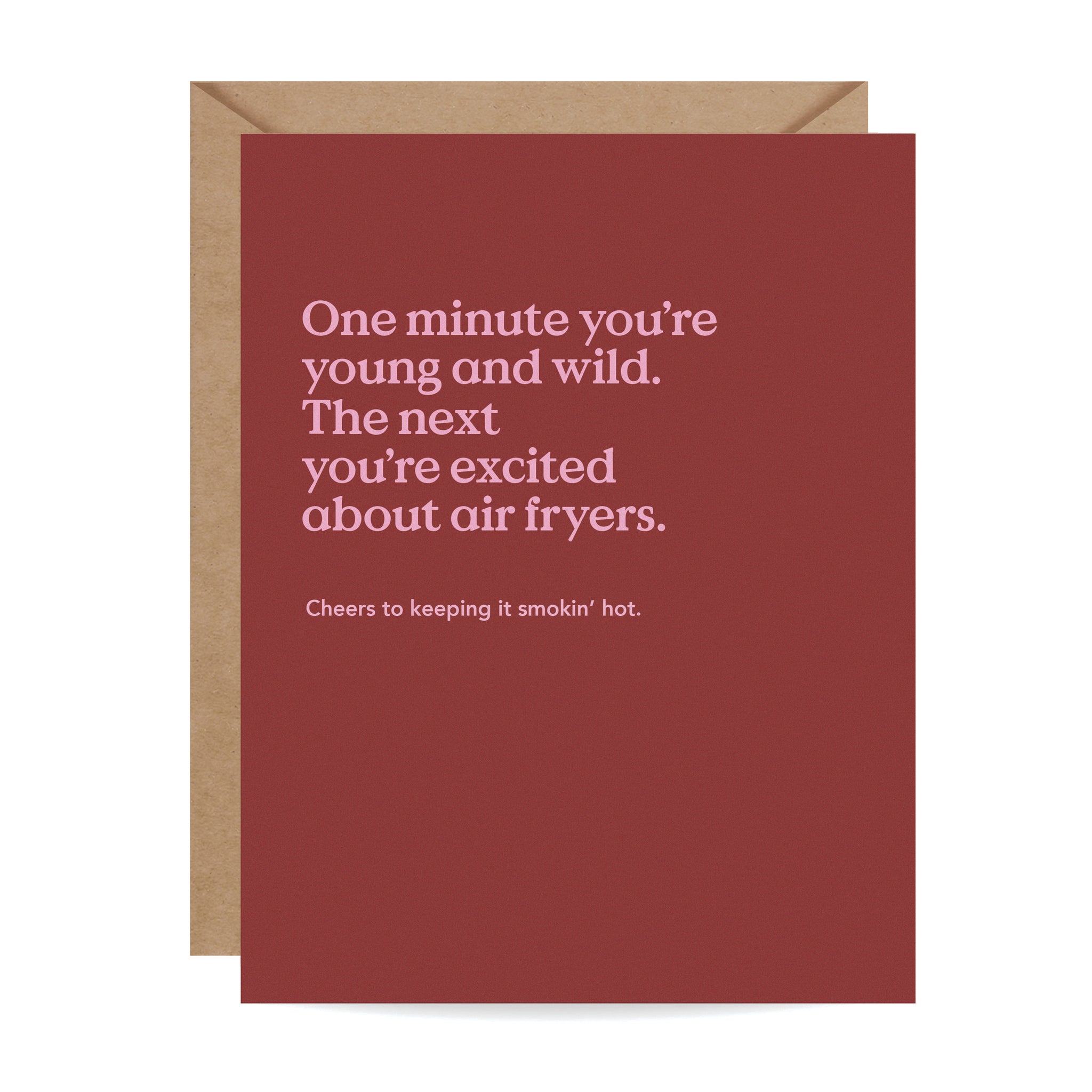 "One day you're young and wild. The next you're excited about air fryers. Cheers to keeping it smokin' hot." This funny birthday card is printed on ultra-thick card stock and comes blank inside for your own message.