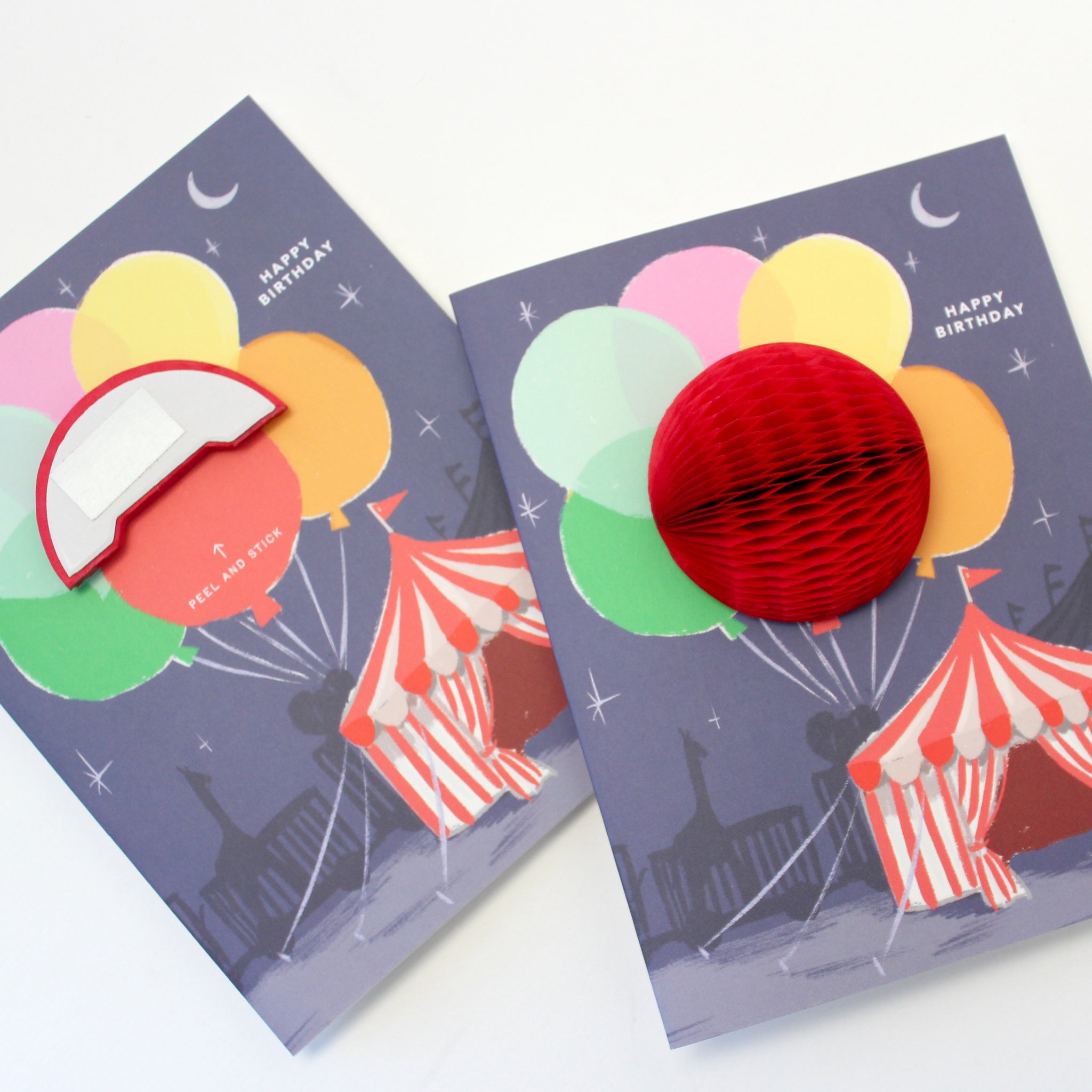This adorable circus-themed birthday card features a honeycomb pop-up balloon! Sustainably-printed on ultra-thick card stock, it comes paired with a brown kraft envelope.