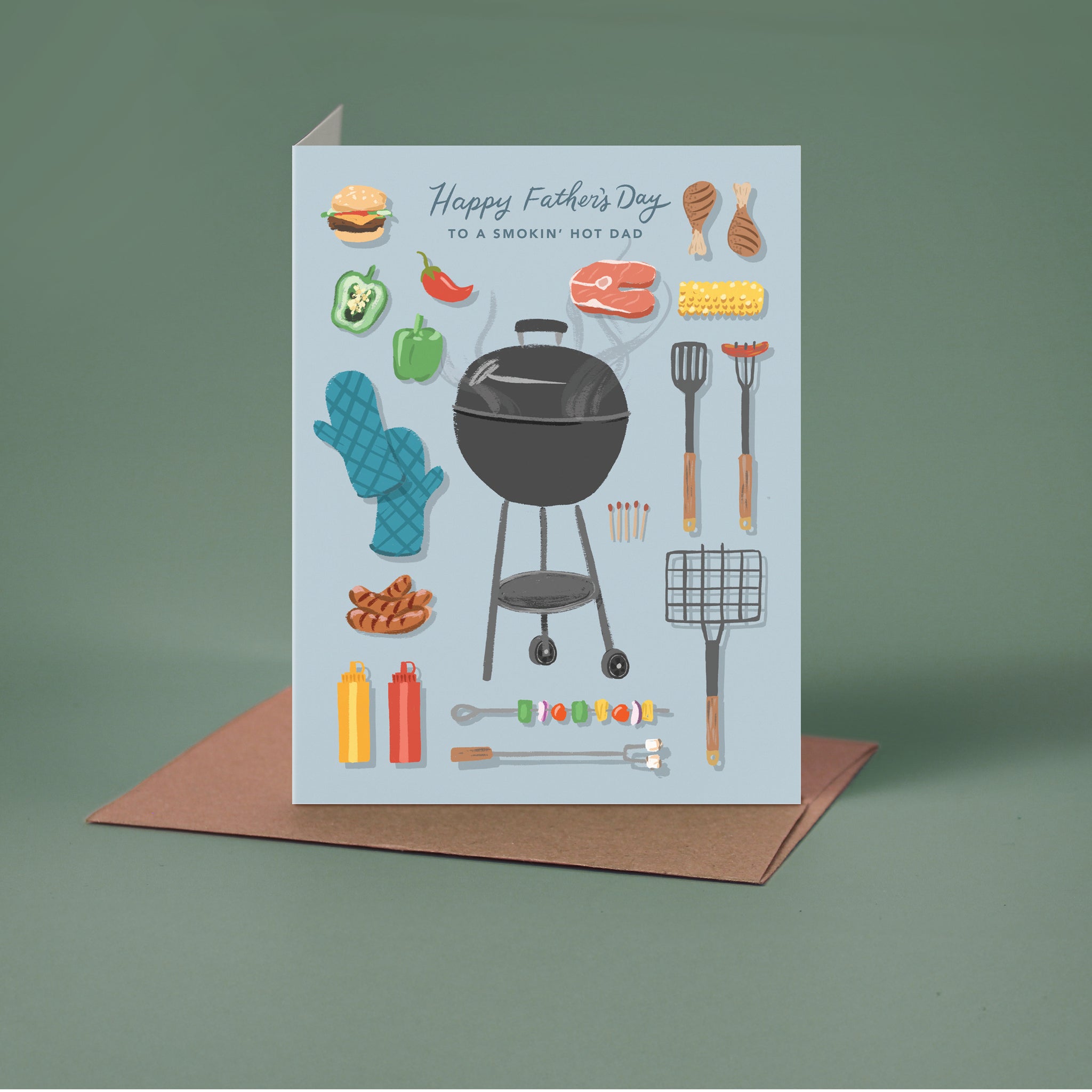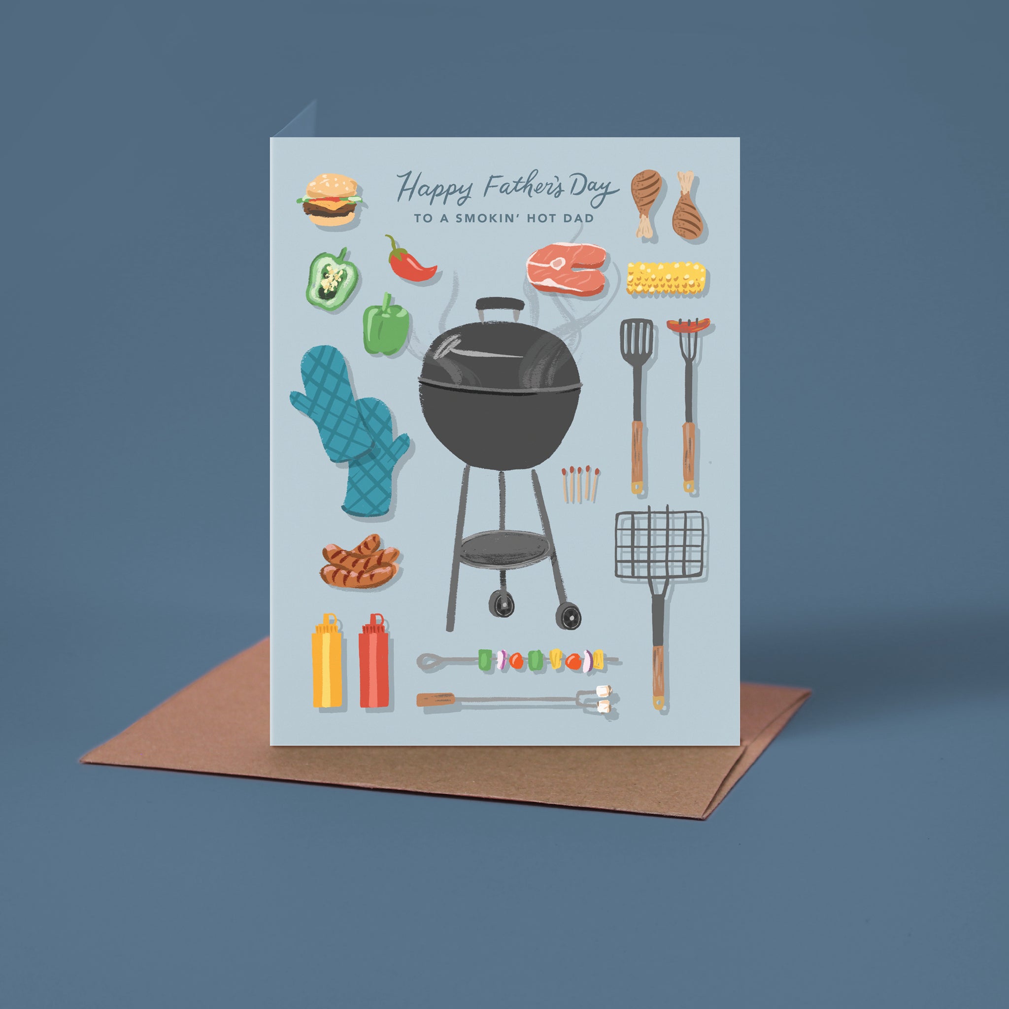 Let him know that he's smokin' hot and that will be the only gift he needs. This Father's Day card is printed on ultra-thick card stock and comes blank inside for your own message. Featuring hand-illustrated grill accessories all of his favorite foods.