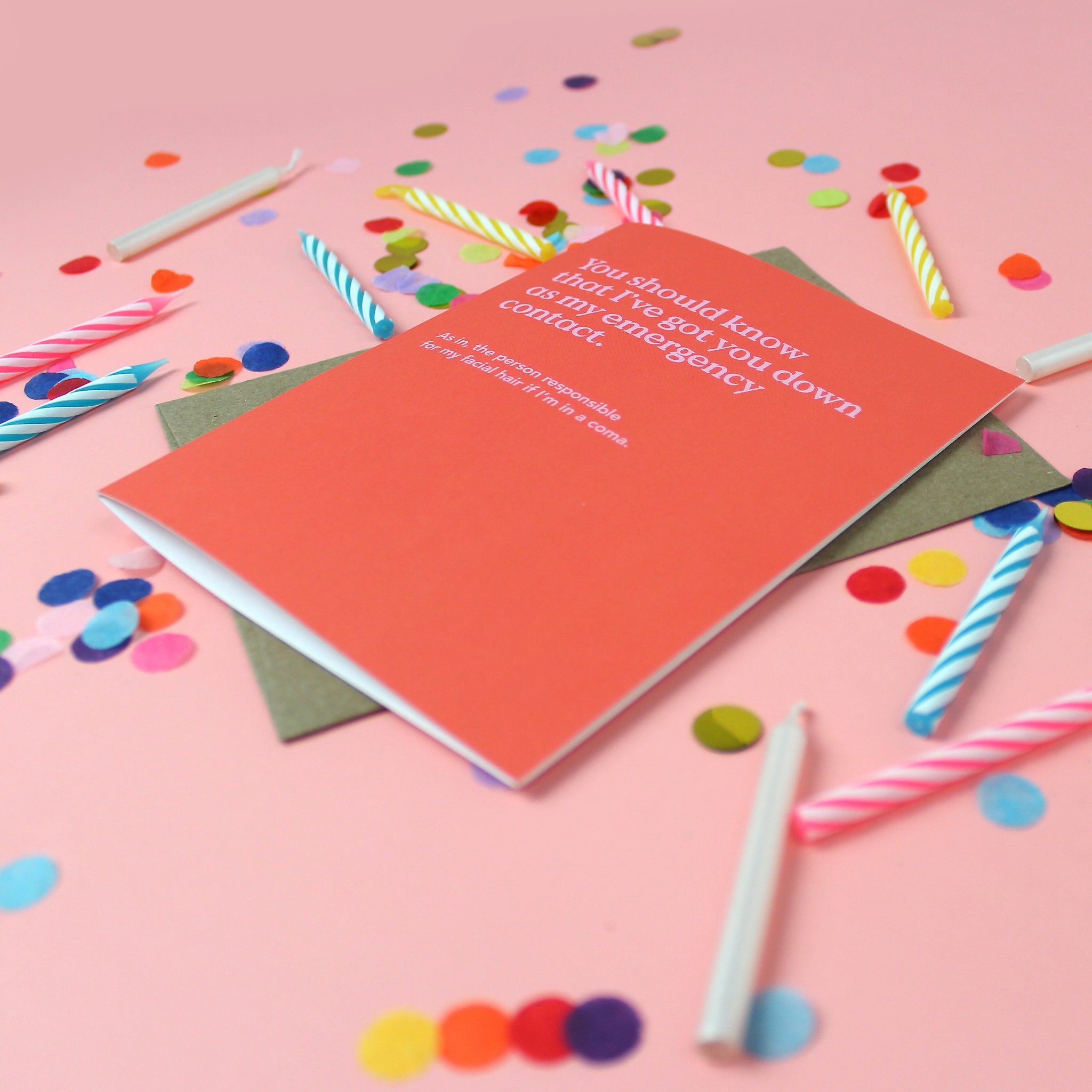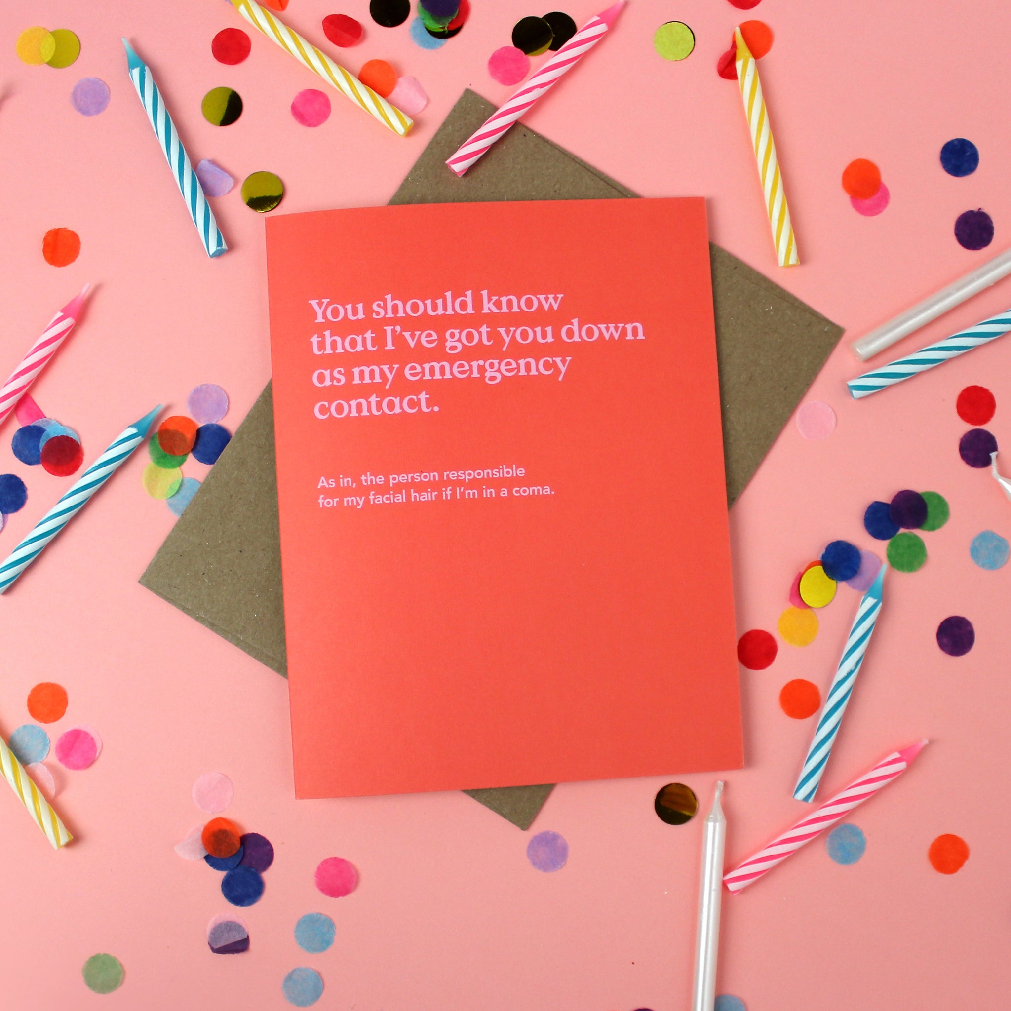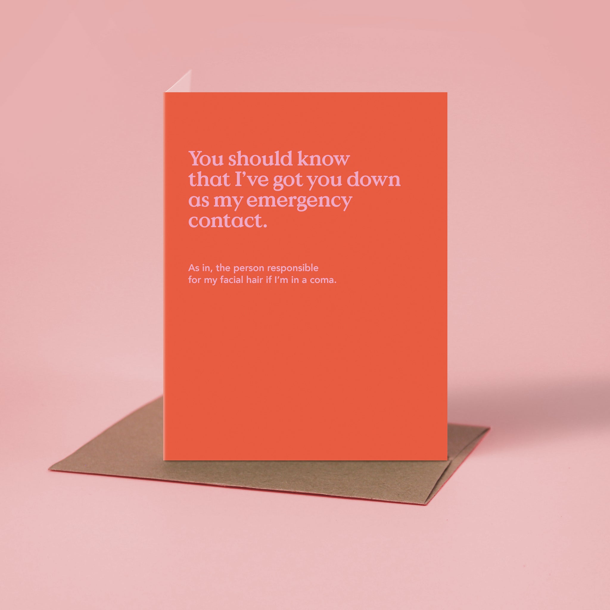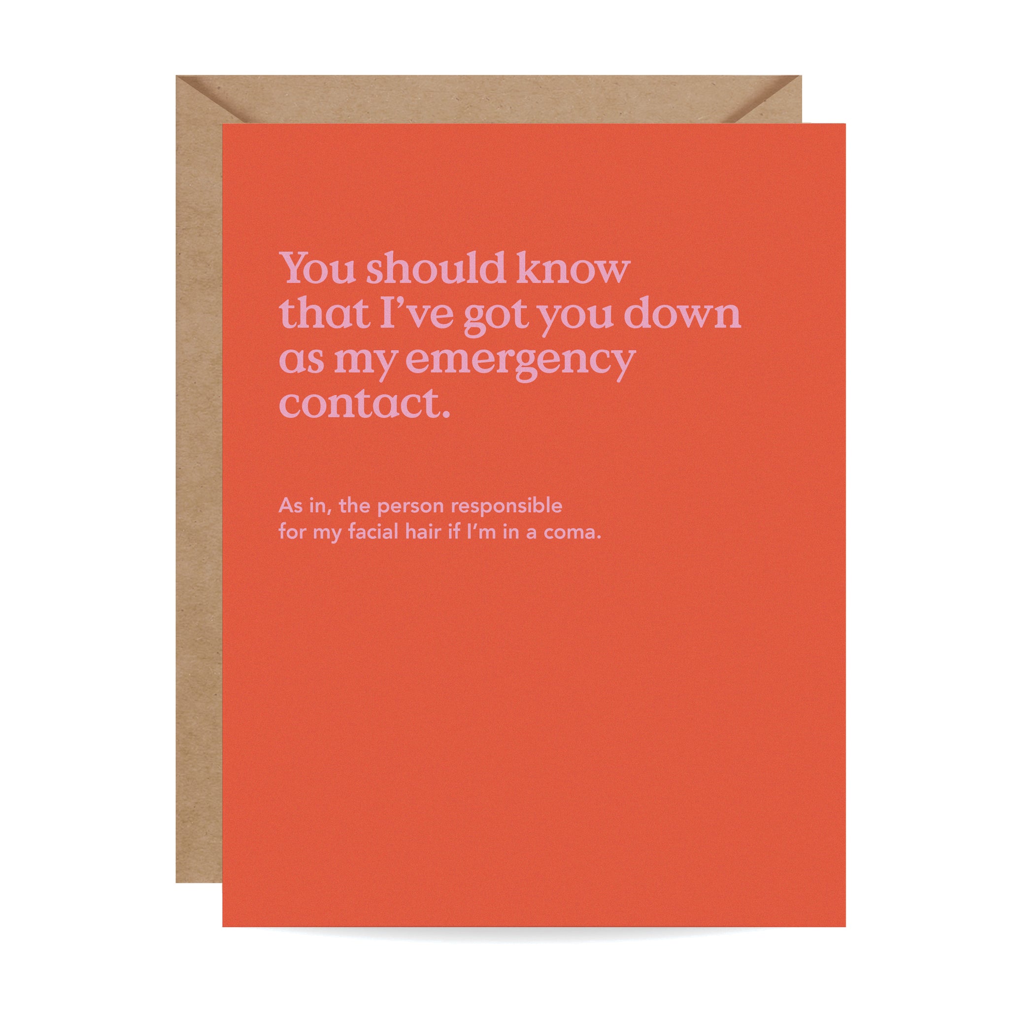 "You should know that I've got you down as my emergency contact. As in, the person responsible for my chin hairs if I'm in a coma." This hilarious friendship card is printed on ultra-thick card stock and comes blank inside for your own message.