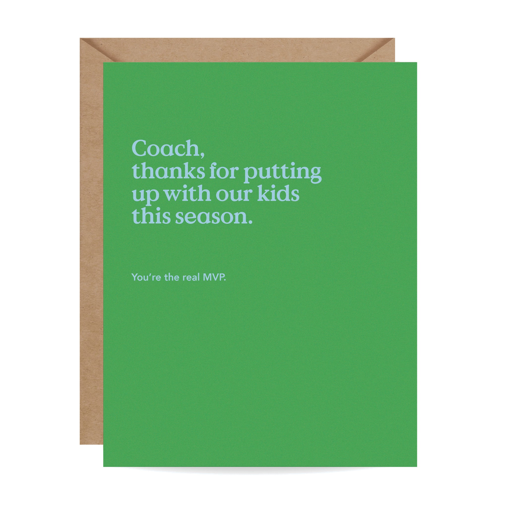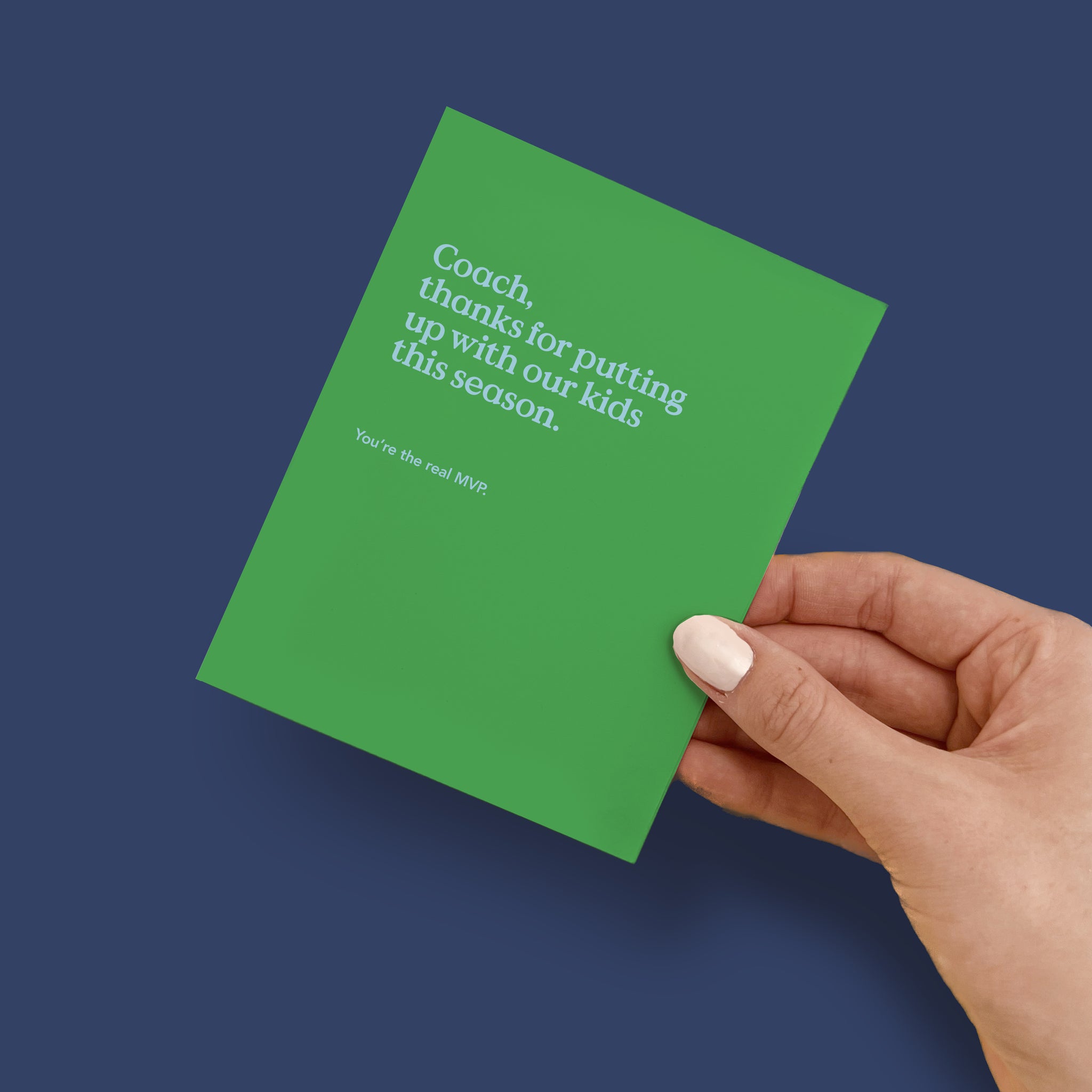 "Coach, thanks for putting up with our kids this season. You're the real MVP." This coach thank you card is printed on ultra-thick card stock and comes blank inside for your own message.