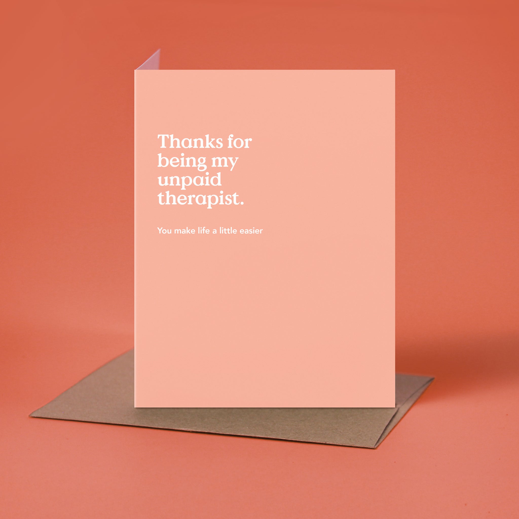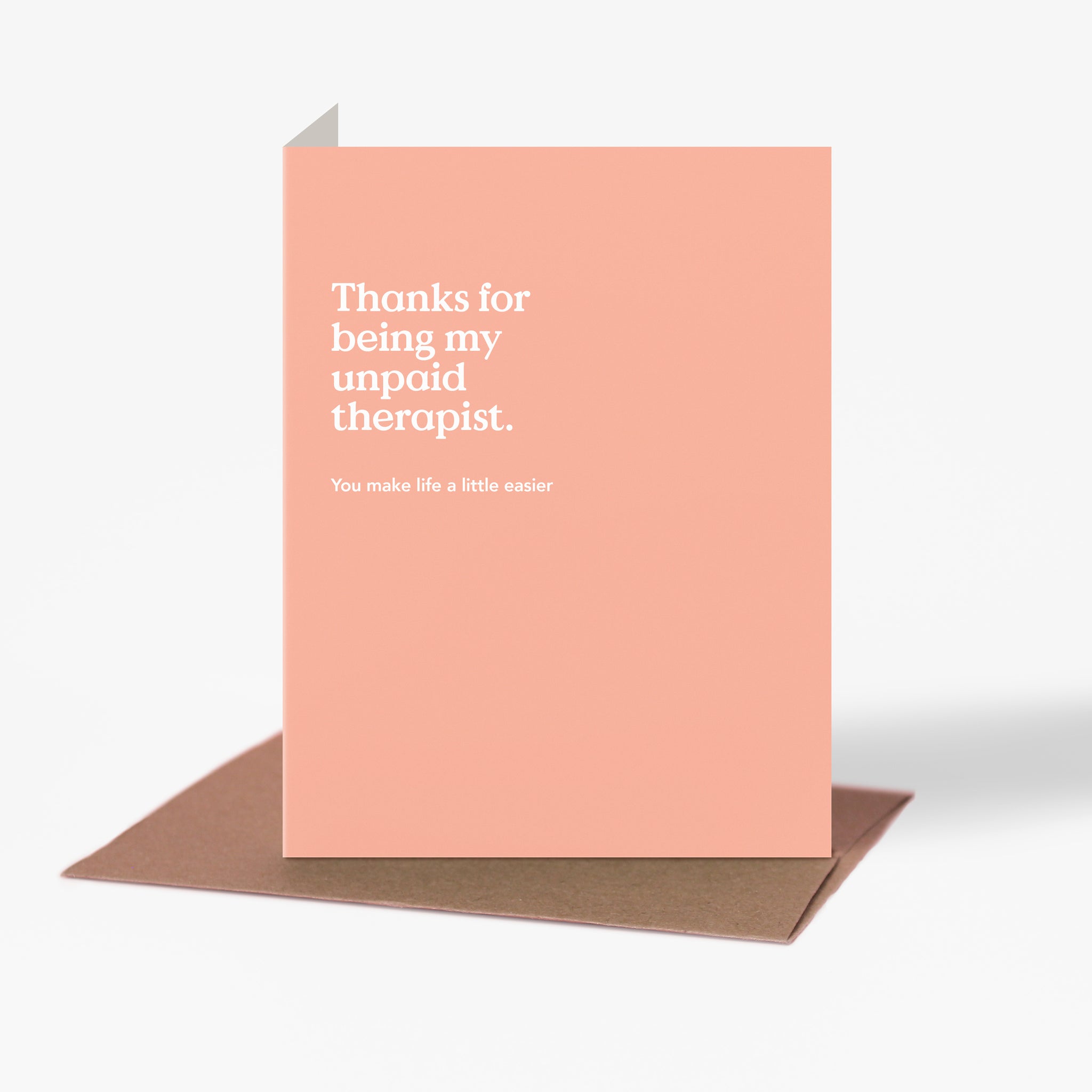"Thanks for being my unpaid therapist. You make life a little easier." This card is printed on ultra-thick card stock and comes blank inside for your own message.