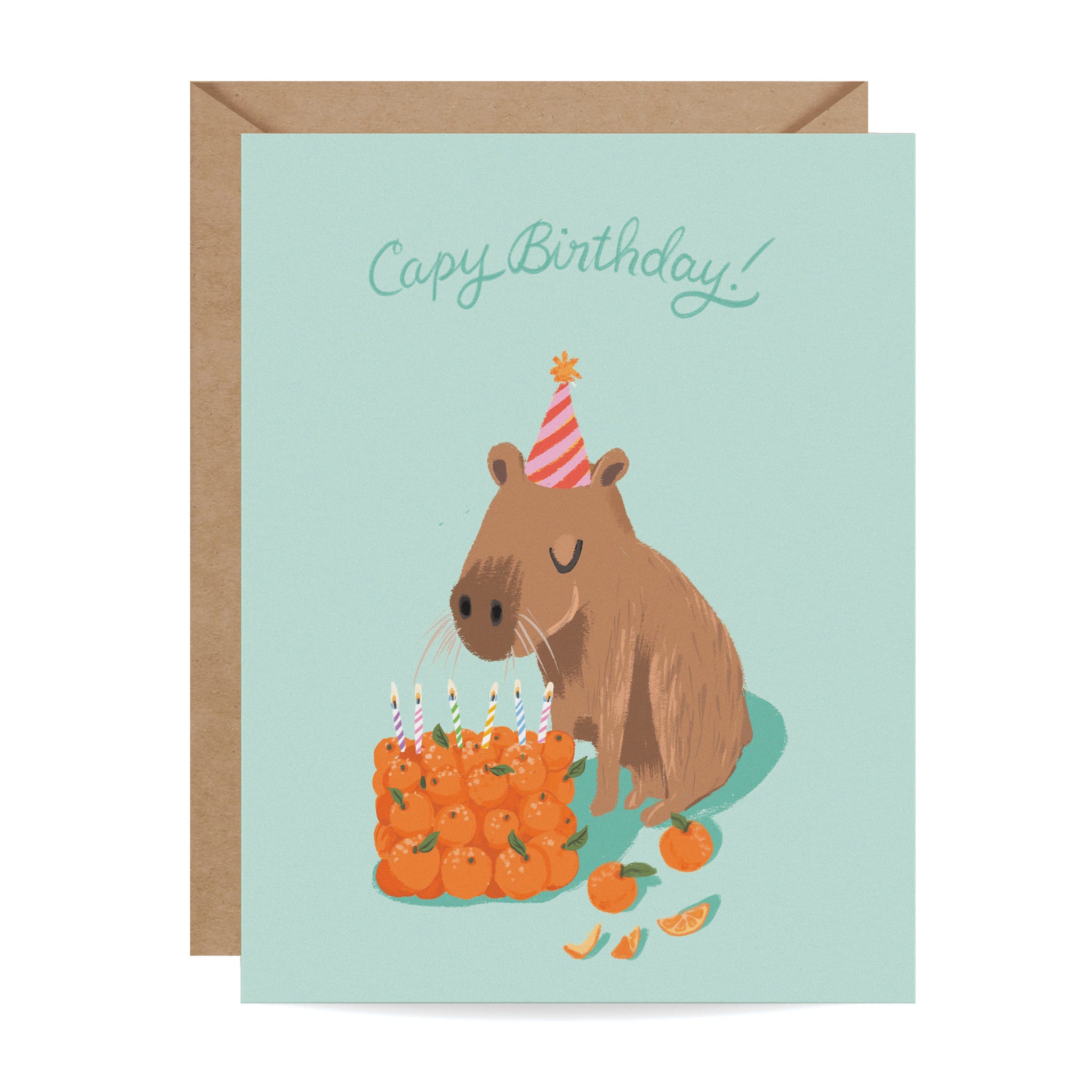 Wish them a "capy" birthday with this adorable capybara birthday card. This greeting card is printed on ultra-thick card stock and comes blank inside for your own message.